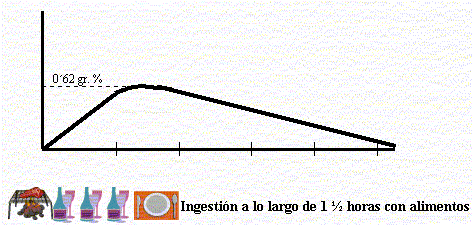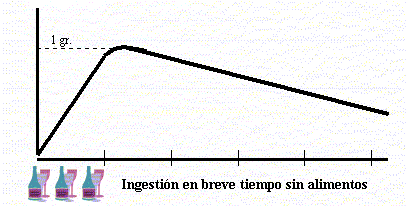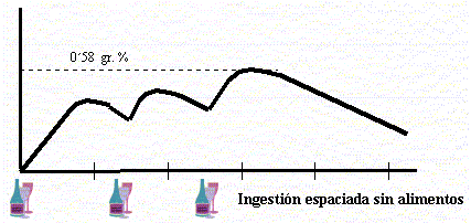 Estos tres supuestos ilustran como la ingestión de la misma cantidad de alcohol en distintas condiciones, conduce a niveles máximos de alcohol y a curvas de alcoholemia muy diferentes.